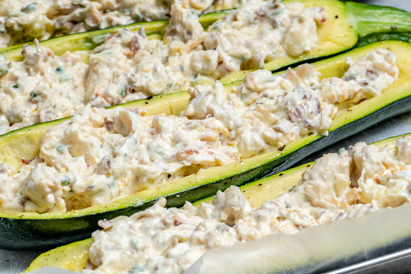 - Combine the reserved zucchini flesh back into your cream cheese mixture, and spoon into the zucchini boats.