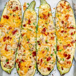 Season zucchini with sea salt and pepper and very lightly spray with oil. Bake for 15 minutes, or just until they begin to soften. Combine the reserved zucchini flesh back into your cream cheese mixture, and spoon into the zucchini boats.