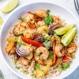 - Assemble your bowls by adding a base of cooked grains like quinoa or brown rice, or cauliflower rice, then top with the jerk shrimp mixture.