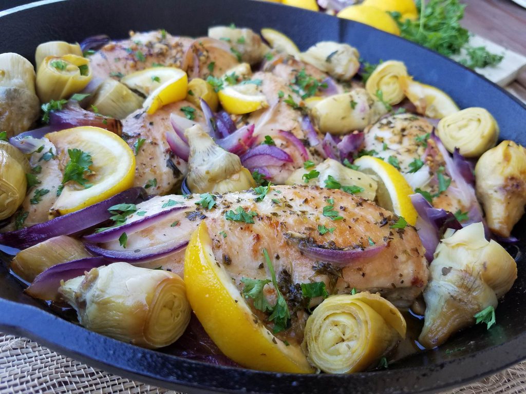 Layer on top of the chicken: slices of fresh lemon, red onion, and artichoke hearts.