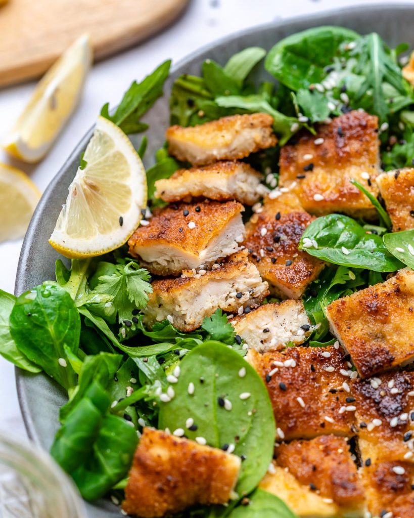 - Place your greens in a large bowl and toss with the dressing. Top with schnitzel pieces, then sprinkle with sesame seeds.