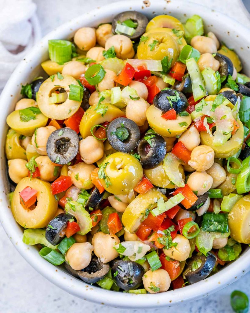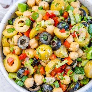 Briney olives combined with crisp veggies, fresh herbs, and creamy chickpeas. Drizzled with a very simple dressing of olive oil and lemon juice. It’s a really great combo!