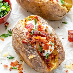 - Top with cheddar, crumbled bacon, a big dollop of Greek yogurt, and green onions/chives.