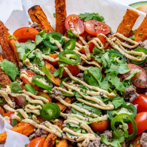 - Layer the sweet potato fries on a large platter and sprinkle with beef, then add toppings of choice.