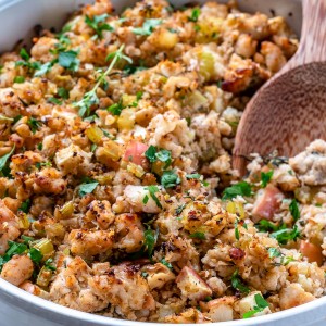 This is THE recipe you’re going to need to make for your low-carb or gluten free friends & family members this holiday season. But then you’ll have a problem because everyone else is going to taste it, and you’ll wish you made more (a lot more)! This delicious and creative cauliflower stuffing disappears quick!