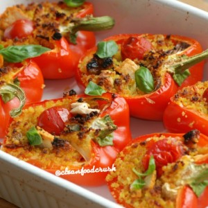 - In a large bowl combine all ingredients very well in a large glass bowl (besides peppers), scoop into prepared peppers.