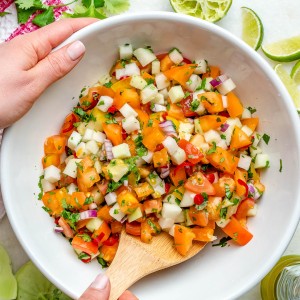 Finely dice your onion and cut the tomatoes into 1/2-inch pieces.