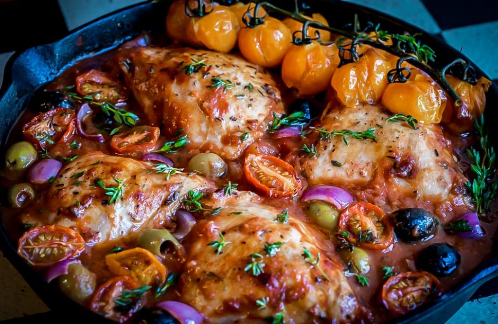 - Heat a large oven-safe skillet, add oil and the chicken thighs, sprinkle with sea salt and pepper to taste - sear until golden on both sides. Set chicken aside on a plate.