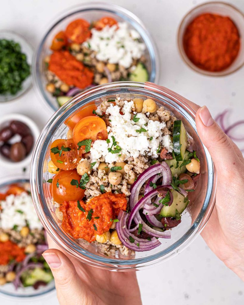 Divide your chopped cucumber, tomatoes, onion, feta, and olives equally among 4 meal prep containers.
