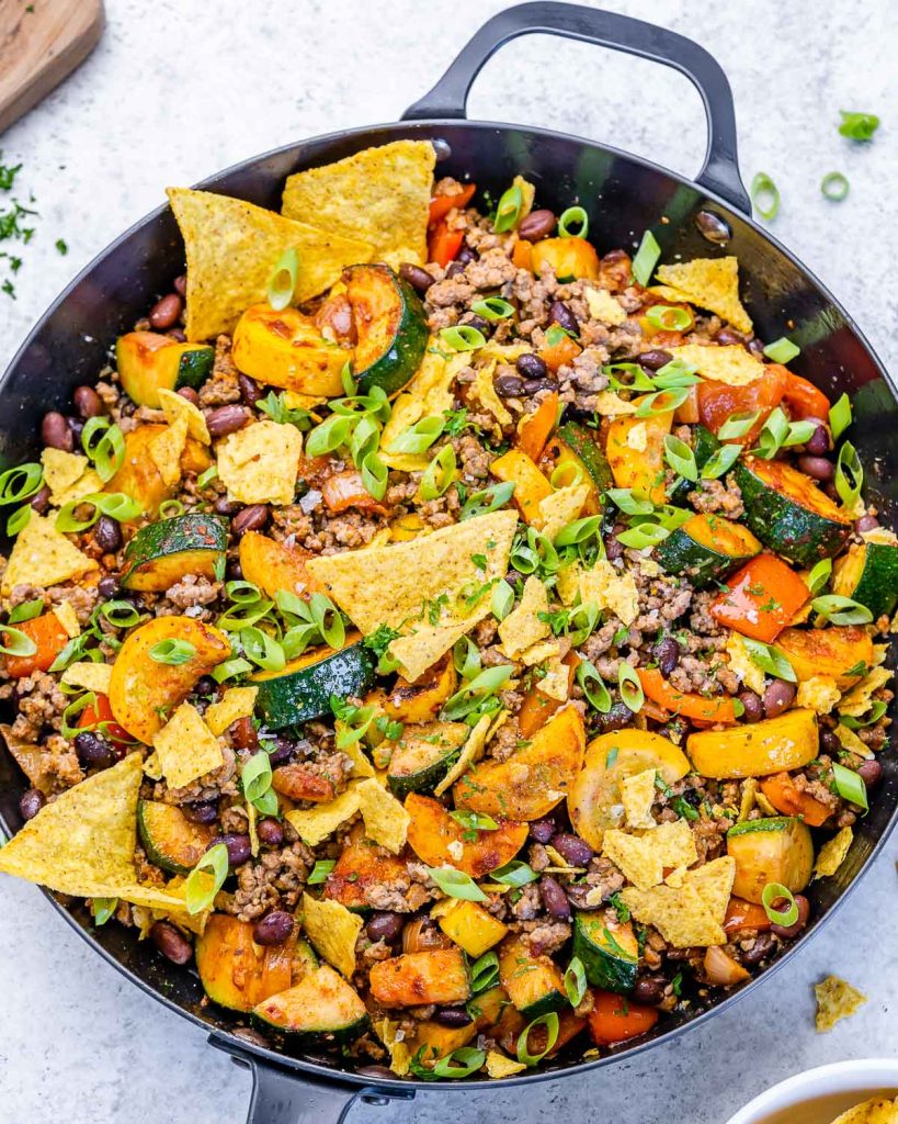 - Return the veggies back into the skillet, stir to heat, then garnish with green onions, freshly chopped herbs, and chips as desired.
