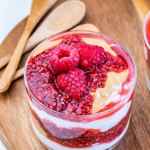 • To assemble your cups, add a layer of cheesecake mix followed by a layer of mashed raspberries and a small drizzle of nut butter as shown.