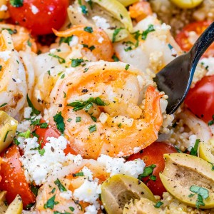 - Top quinoa with your cooked shrimp, tomatoes, olives, feta, and parsley as shown.