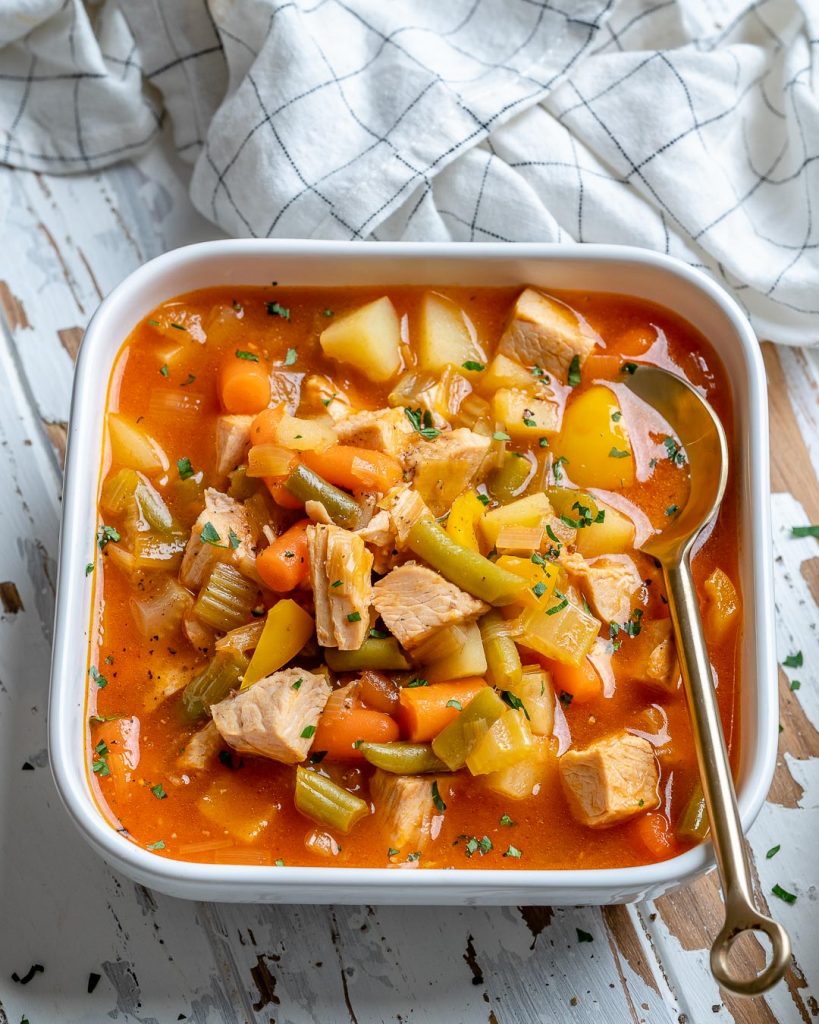 Add in chopped potatoes, carrots, green beans and cubed turkey. Pour in the turkey broth and tomato sauce and give everything a good stir and bring to a boil.