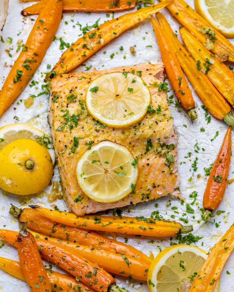 Simply add 1/2 cup of brown rice, or quinoa, your roasted carrots, lemon wedges, and a salmon filet, to each food prep container.