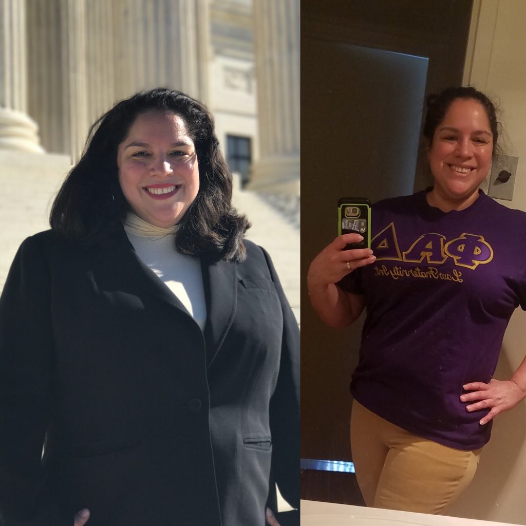 Now I weigh 222. I’m still an hourglass, but now I’m 49, 40, 47. My arms are 15 inches and my thighs are 24 inches. I went from a 2 XL to between an XL and a large!