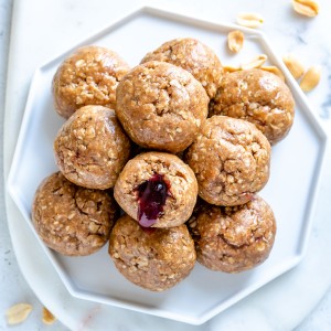 Add about 1/2 teaspoon of jam in the center of each nest, then gently wrap and mold the peanut butter mixture around to close the ball.