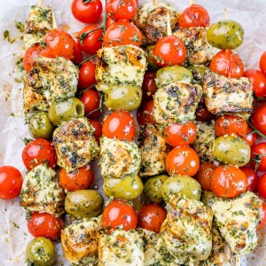 - Thread the pesto-coated chicken, cherry tomatoes, and olives onto skewers.