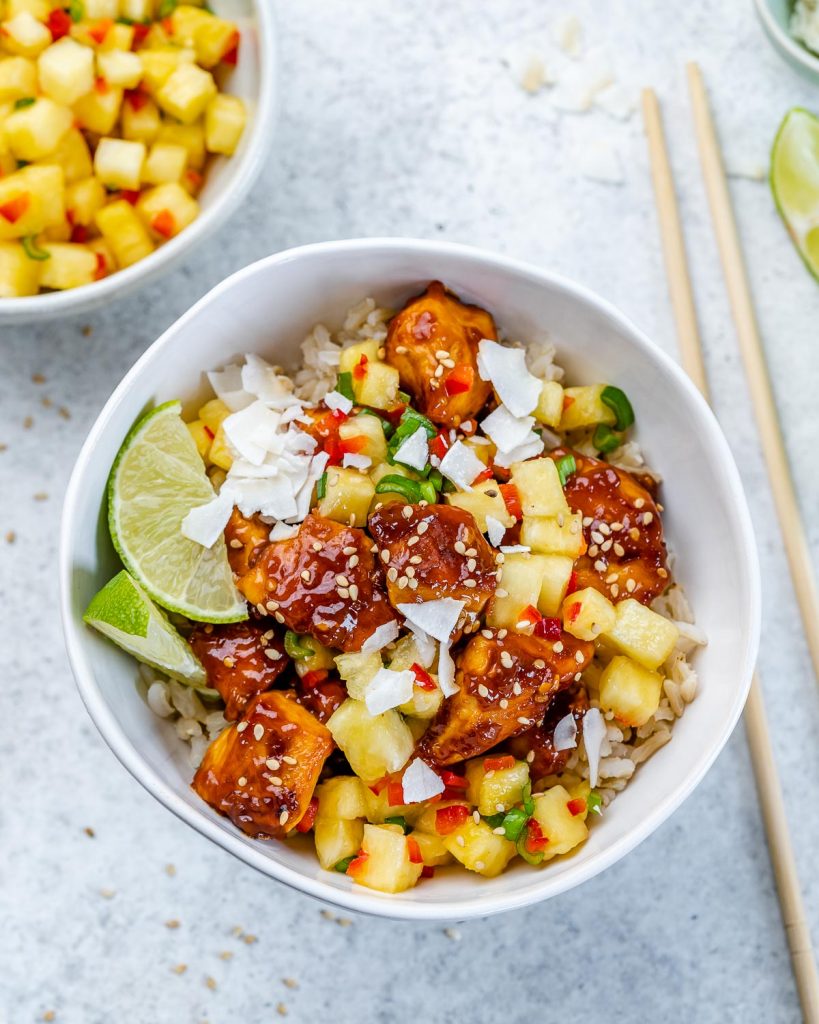 Serve your chicken with sauce over cooked brown rice, quinoa, or cauliflower rice, then top with a big spoonful of your fresh pineapple salsa, fresh cilantro, limes wedges, and shredded coconut.