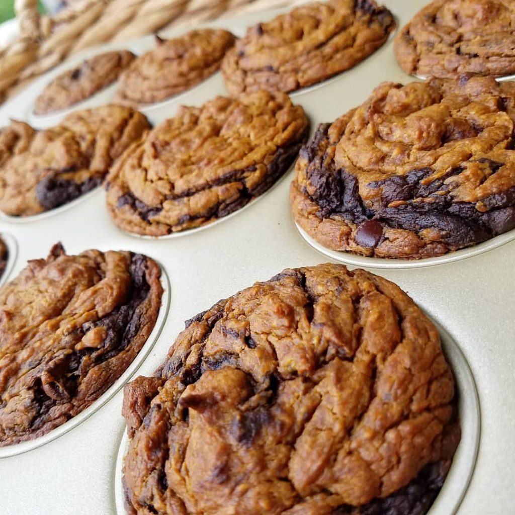 Scoop 1/2 of EACH batter into each muffin tin, so it’s half chocolate, half pumpkin color.