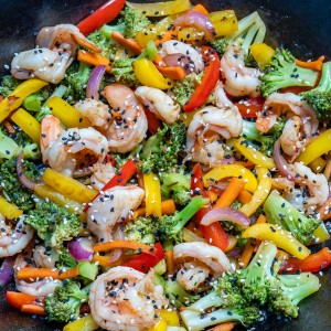 Drizzle in your stir fry sauce and stir everything together until thickened, about 2 minutes, then stir in the cooked shrimp. Stir shrimp just to coat with sauce and warm.