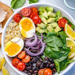 - To assemble your lunch bowl add in the cauliflower rice, beans, then top with chopped baby spinach, red onion, cherry tomatoes, avocado, and boiled eggs.