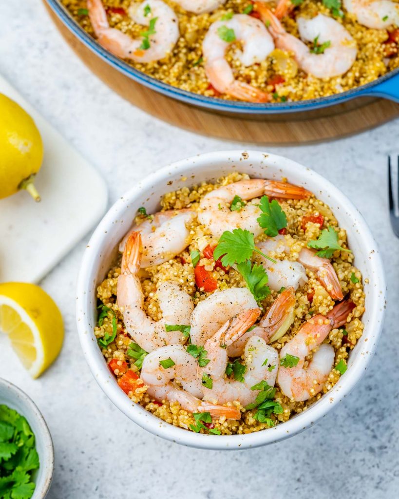 - Remove the lid and arrange your shrimp over the quinoa in the pan. Season with a pinch of sea salt and freshly ground black pepper.