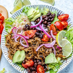 Assemble your chopped lettuce and rice on the bottom of each serving bowl. Top with your pork. Add in all of your favorite toppings (tomatoes, avocados, green onion, cilantro, salsa, lettuce, cheese, etc.) then squeeze some fresh lime juice on top.