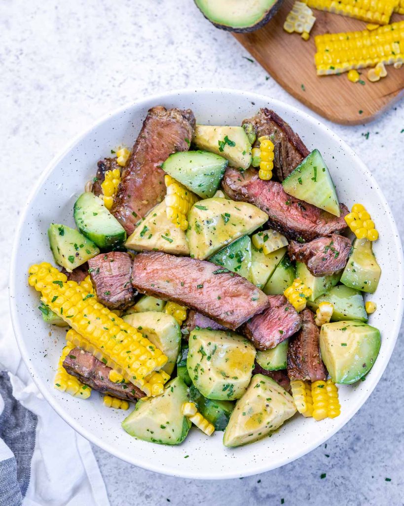 We have crunchy cucumber along with creamy avocado and fresh sweet corn, cut from the cob. Cook up your steak the way you love, throw it on there and drizzle everything with the tangy homemade dressing. There you’ll have all the flavors and textures to create an ultra-satisfying summertime meal! You’re going to love it!