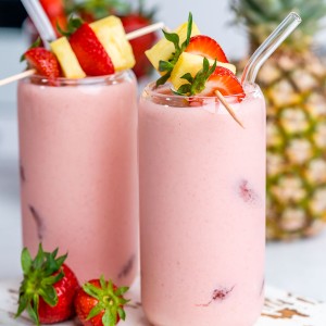 - Place coconut milk, strawberries, and pineapple in a blender and blend until smooth. If you're using fresh fruit instead of frozen fruit, you'll want to add a few ice cubes. If you're using frozen fruit, you don't need ice cubes.