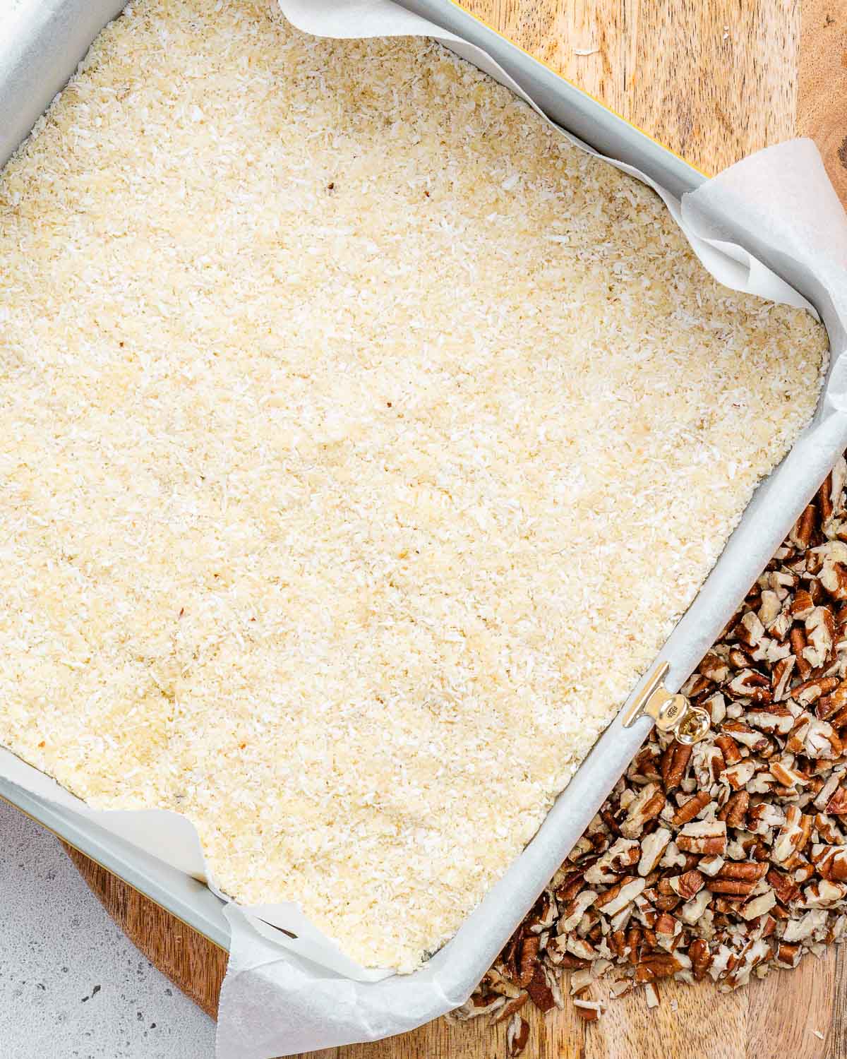 - Transfer to the prepared baking dish and press into a firm, even layer creating a crust. Bake in your preheated oven for 12-15 minutes or until just slightly golden.