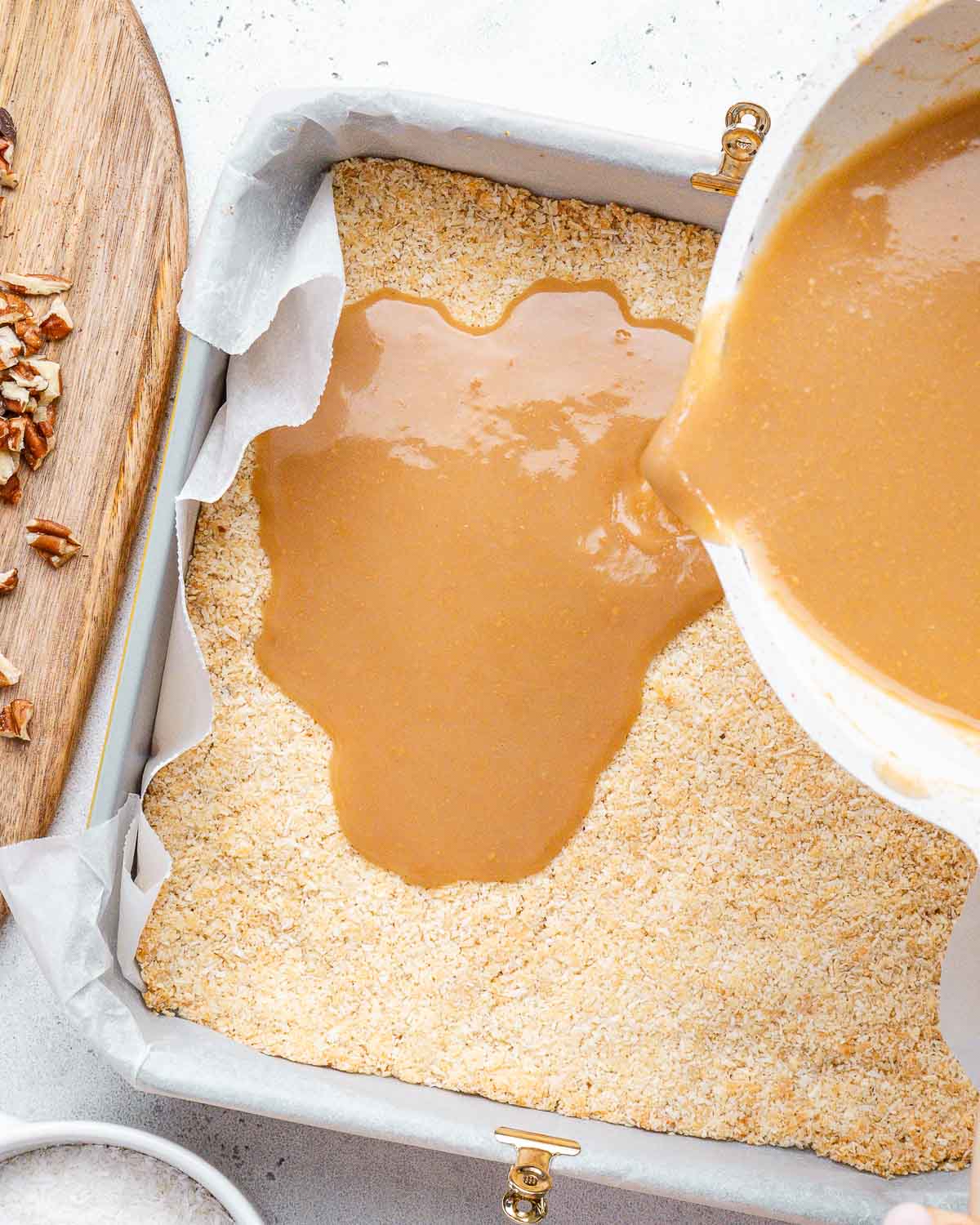 - Natural Sugars: Instead of using sweetened condensed milk, we create a gooey, delicious layer that is similar by mixing together raw honey (or maple syrup if you prefer a vegan choice), almond butter, and coconut milk! I promise, this layer does not disappoint!