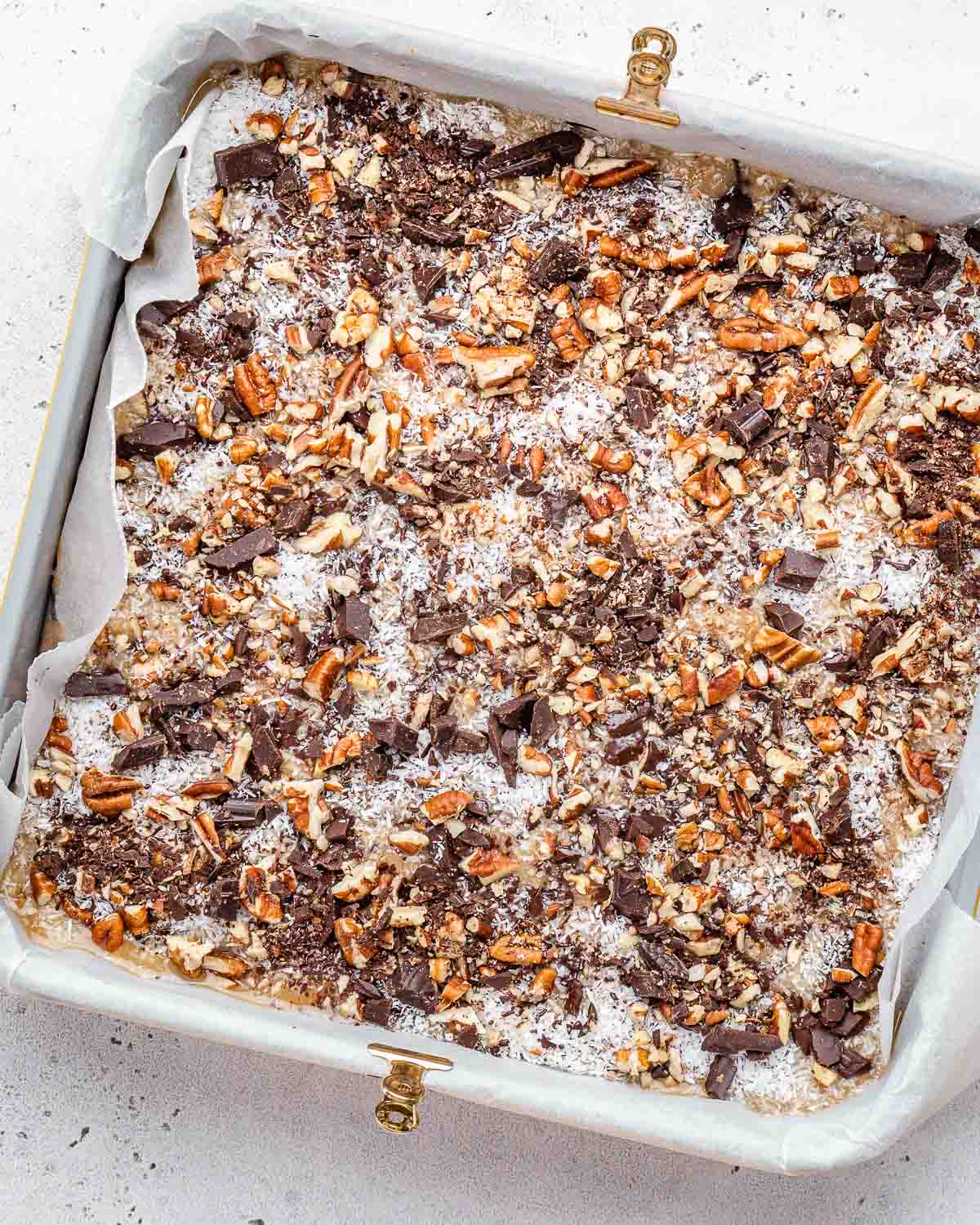 - Spread this mixture over the crust in the dish, then sprinkle evenly with chocolate chunks/chips, coconut, and pecans.