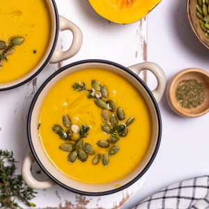 - Garnish with roasted pumpkin seeds and fresh thyme and enjoy while hot!