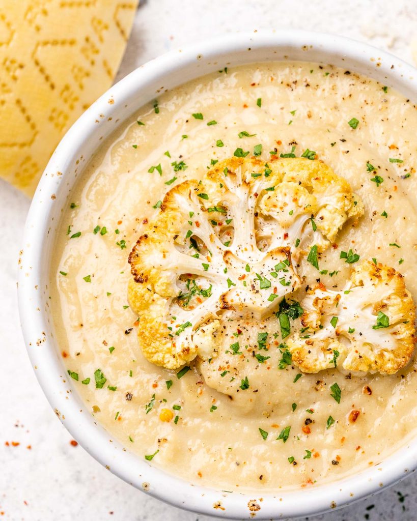 Next time I make this, I’m going to throw an entire head of fresh garlic on the sheet pan (wrapped in parchment) and let it roast along with the cauliflower before adding it to the soup! I didn’t think of that until after filming this video – but I know the final result would be phenomenal!