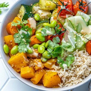 - Arrange roasted pumpkin and veggies as desired nicely around the bowls as shown in the photos, to be able to see a bit of each.