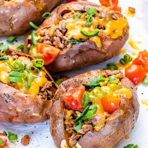 Since we’re all trying to keep our food budget in check while simultaneously feeding our family TASTY, satisfying, and super nutritious meals – when sweet potatoes go on SALE I buy a BUNCH and create a meal out of em’.