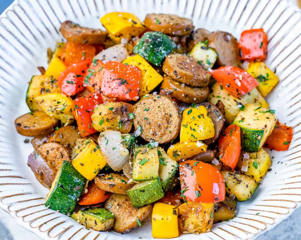 Most stores carry an awesome selection of healthier chicken & turkey sausages these days. I usually purchase whatever is on sale that week. Just flip the package over and read through the ingredients. Look for minimal processing and no added sugars.