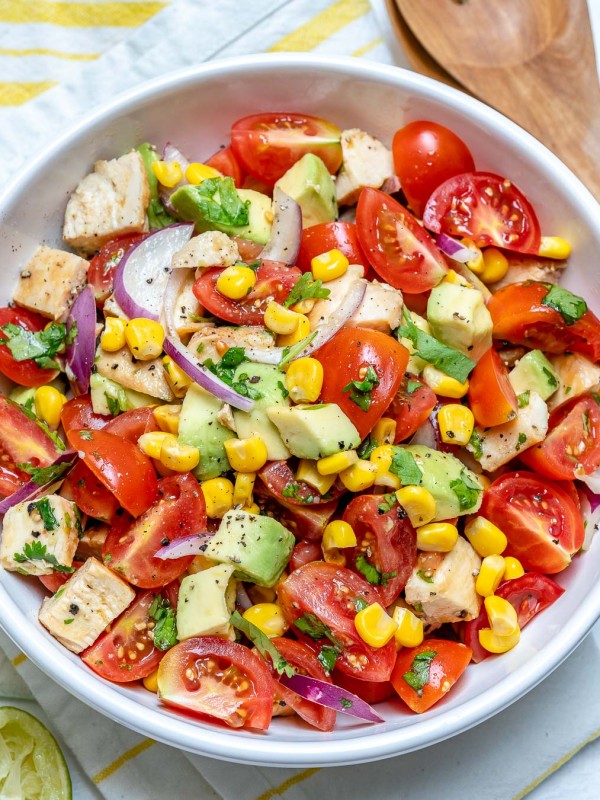 RecipesCalifornia Cobb Strawberry Salad with Lemon Pepper Chicken and Homemade Avocado Ranch Dressing