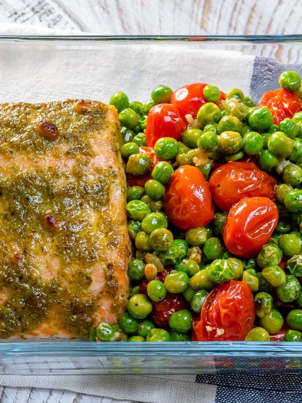 One-Sheet Pan Tomato Pesto Salmon for a Fast, Clean Eating Dinner Idea!