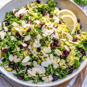 In a large bowl add your Brussels sprouts, kale, cranberries, almonds, and quinoa. Drizzle in the dressing and toss gently to combine well.