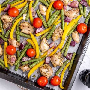 - Continue to roast for 8-10 minutes, or until veggies are tender-crisp and chicken is fully cooked through.