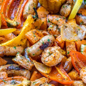 Arrange the shrimp and veggies on your sheet pan, around the sweet potatoes, and sausage as shown, then continue to roast until your shrimp is cooked through, about 10 minutes more depending on size.