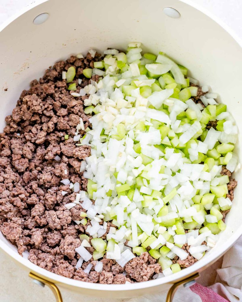 - Drain any excessive grease and season lightly with sea salt and ground pepper. Stir in the diced onion, celery, garlic, and seasonings then cook while stirring for a few more minutes.