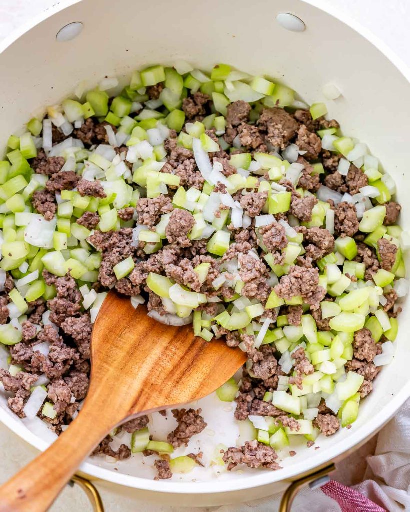 - wooden spoon. Drain any excessive grease and season lightly with sea salt and ground pepper. Stir in the diced onion, celery, garlic, and seasonings then cook while stirring for a few more minutes.