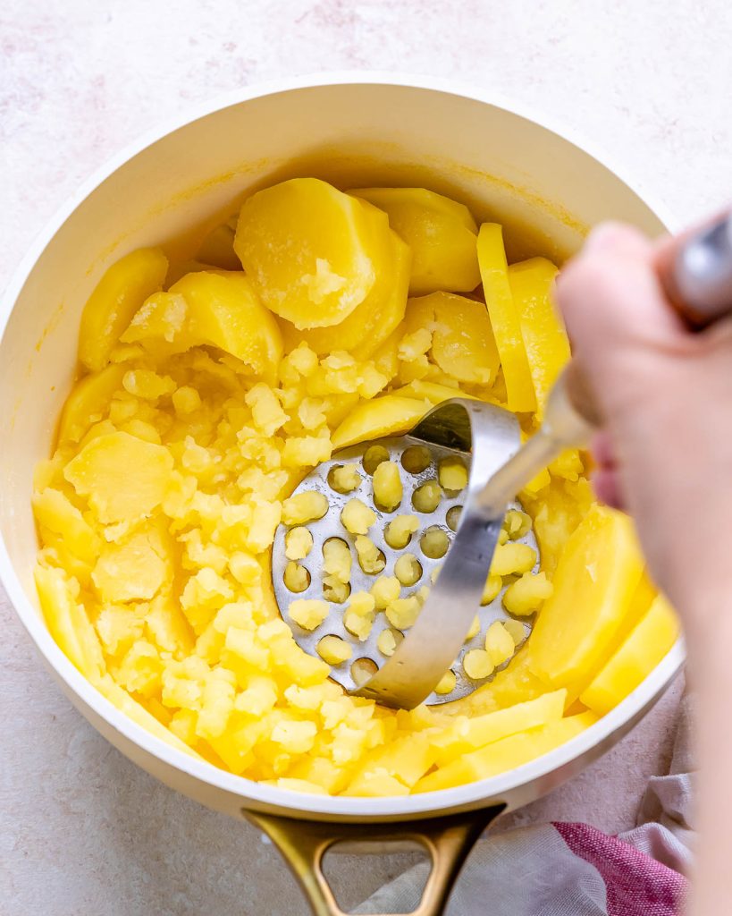 - Boil your potatoes in salted water until tender (about 20 minutes), then drain all the liquid. Remove about half of your cooked potatoes and set aside. Mash the remaining potatoes in the pot with the butter or ghee. Season lightly with sea salt and pepper to your taste.