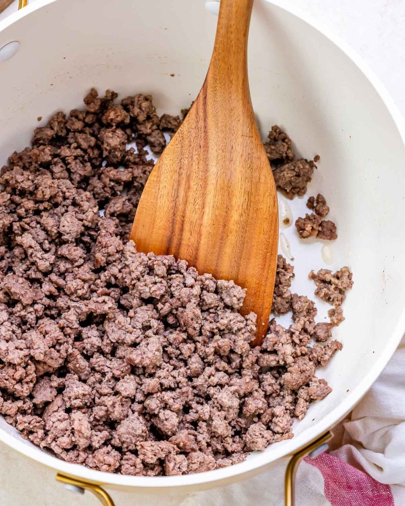 - Meanwhile, in a large stockpot or Dutch oven, add your ground meat of choice and cook, mincing it with a