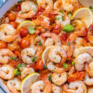 - Return your cooked shrimp into the sauce, stir to heat through, and garnish with freshly chopped parsley and basil.