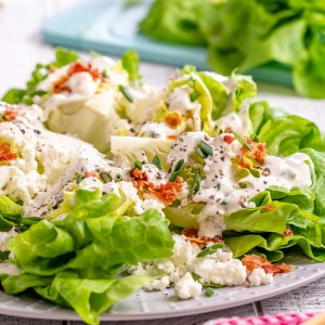 A quick Wedge Salad made of buttery crisp lettuce, drizzled with a creamy + tangy homemade dressing will hit the spot