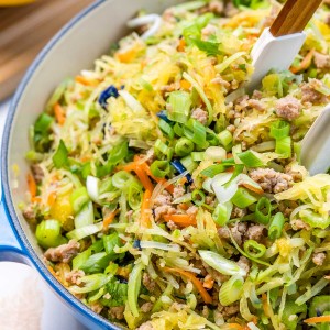 - While the spaghetti squash is cooling, heat your sesame oil over medium heat in a large skillet or wok. Add the onion, celery, coleslaw mix/cabbage, minced garlic, and ginger, stirring to combine. Stir fry for about 8-10 minutes, stirring frequently.