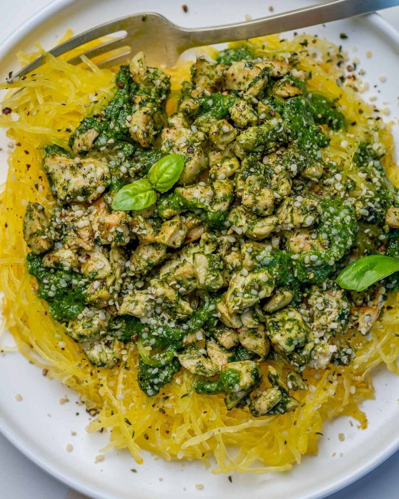 - Divide squash evenly between plates and top with your chicken and pesto mixture.